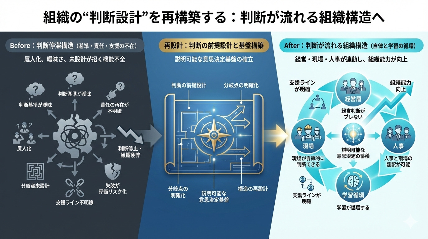 しかし、組織判断レビューで可視化された「判断の滞り」をもとに設計することで、
